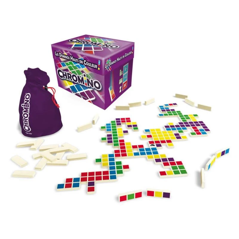 Basé sur le principe des dominos, Chromino est un jeu où chaque pièce est composée de 3 carrés de couleur, chacun pouvant être de couleur différente. Une pièce doit être posée sur la surface de jeu en faisant coïncider 2 couleurs de la pièce à poser avec une ou plusieurs pièces du jeu.