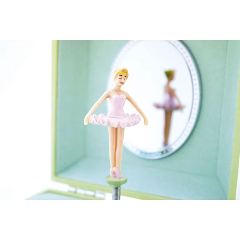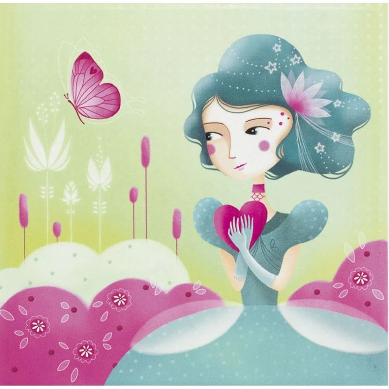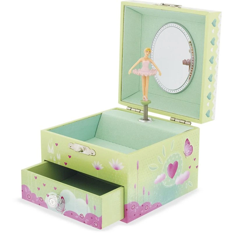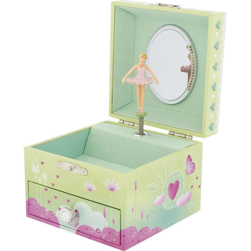 La boîte à bijoux musicale Papillon est illustrée avec un paysage parsemé de papillons. Les tons pastel et la rondeur des illustrations donnent un aspect délicat et tendre à cette boîte à bijoux. Votre petite fille pourra remonter le mécanisme à l’aide de la clef située au dos de la boîte pour voir la danseuse tourner sur l’air de Poupée de cire de Serge Gainsbourg.