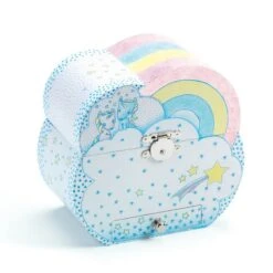 Rêves de licornes est une boîte à bijoux musicale Djeco qui prend la forme d’un nuage surmonté d’un arc en ciel et parsemé d’étoiles, de flocon de neige et de cœur.
