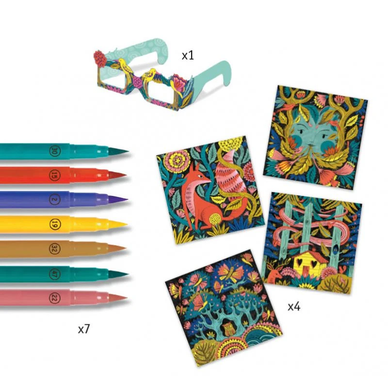 Forêt fantastique est un loisir créatif de coloriage qui propose de colorier des illustrations poétiques sur le thème de la forêt et de les admirer en 3 dimensions grâce aux lunettes fournies.