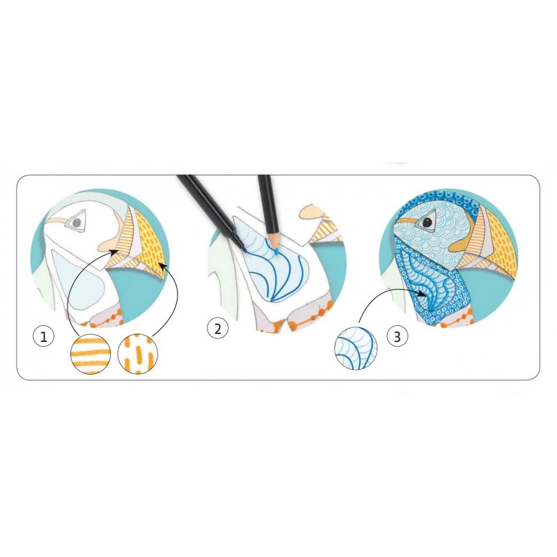 Entre dessin et coloriage ce coffret vous guidera dans la réalisation de ces dessins basés sur l’art du motif. Les enfants devront alterner entre les feutres et les crayons de couleurs inclus pour réaliser les motifs en suivante les explications du livret. Une activité calme requérant concentration et précision pour des résultats surprenants.