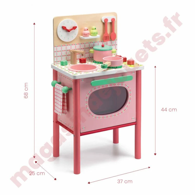 La cuisinière de Lila est une cuisine djeco au couleurs très girly. Principalement dans les tons roses, cette jolie cuisinière est relevée par des touches de vert foncé, de vert anis et de rouge. Les dessins sur le four et les motifs sur le plan de travail et la crédence lui donne également beaucoup de cachet. Bien que compacte, cette cuisinière est très complète : elle possède un évier, un grand four et 2 plaques de cuisson.
