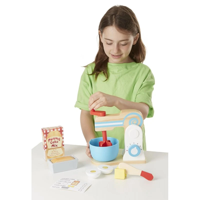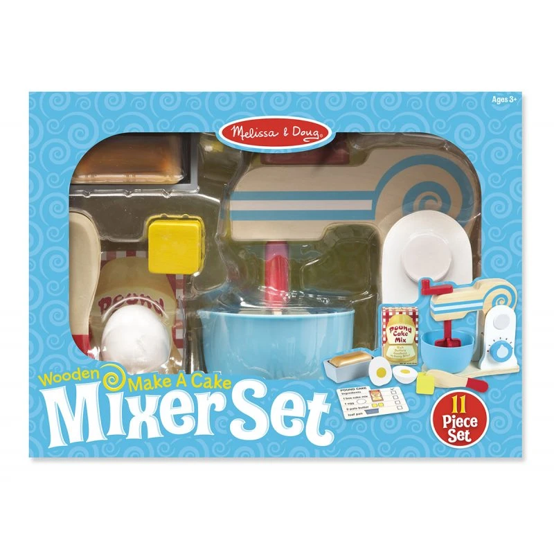 Les ingrédients en bois comprennent deux morceaux de beurre et un œuf en deux parties, qui sont attachés par velcro et qui peuvent être tranchés par le couteau en bois. Suivez les instructions de la recette pour faire le gâteau – l’ensemble comprend en plus une boîte de mélange de gâteau, un moule à gâteau, et un gâteau fini.