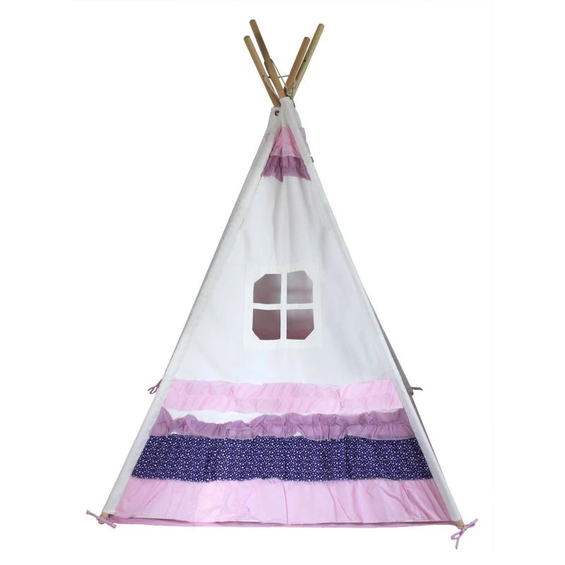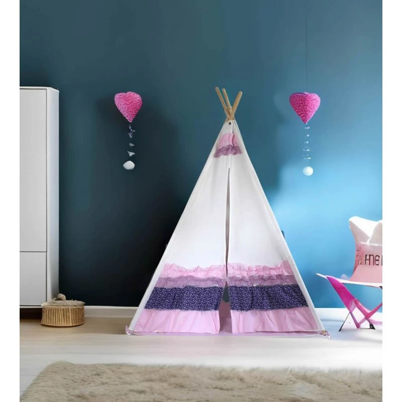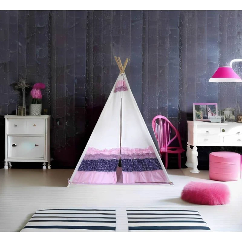 Ce tipi est très original et ne laissera pas indifférent. Les volants roses et violets cousus sur ses flans lui donnent un aspect unique. Les contrastes de couleur et de matière en font un bel objet de décoration dont les petites filles seront extrêmement fières. Grand et robuste ce tipi à froufous accompagnera votre fille de longues années.